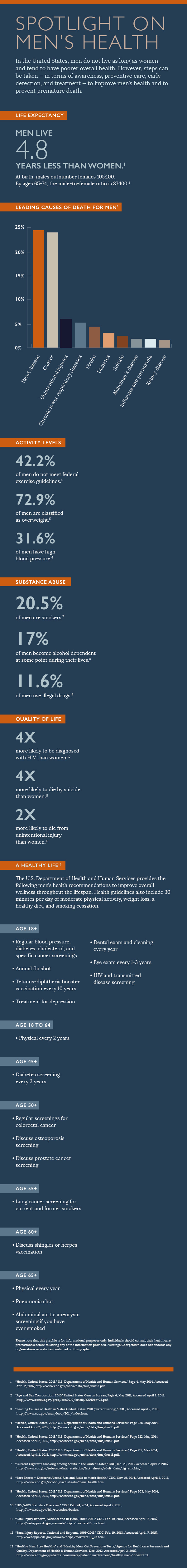 Men live an average of 4.8 years less than women, and despite this rate improving over time (down from 5.2 years in 2000), there are still steps that can be taken in health education and to raise awareness to improve men’s health. We created a new infographic to explore men’s health in detail and to collect guidelines for improving men’s overall wellness.
