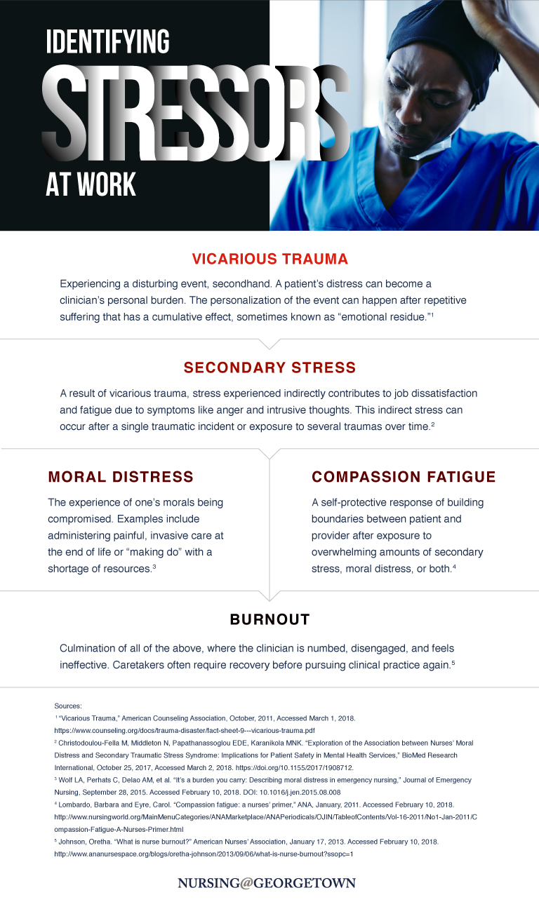 The pitfalls of compassion fatigue, secondary trauma, moral distress, and burnout are widespread. A literature review published in Archives of Psychiatric Nursing noted that across all nursing specialties examined, the “presence of secondary traumatic stress in nurses was reported in all of the studies.”